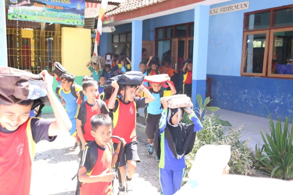 Untuk mengenalkan jargon tadi, Badan Penanggulangan Bencana Daerah (BPBD) Kabupaten Pangandaran mengajak anak-anak untuk menyanyikan lagu sekaligus memperagakan gerakan. “Apabila ada gempa, lindungi kepala…” demikian potongan lagu sambil anak-anak menirukan tim sosialisasi BPBD. Anak-anak mengikuti dengan semangat setiap lagu dan gerakan untuk bekal siaga menghadapi ancaman bencana.