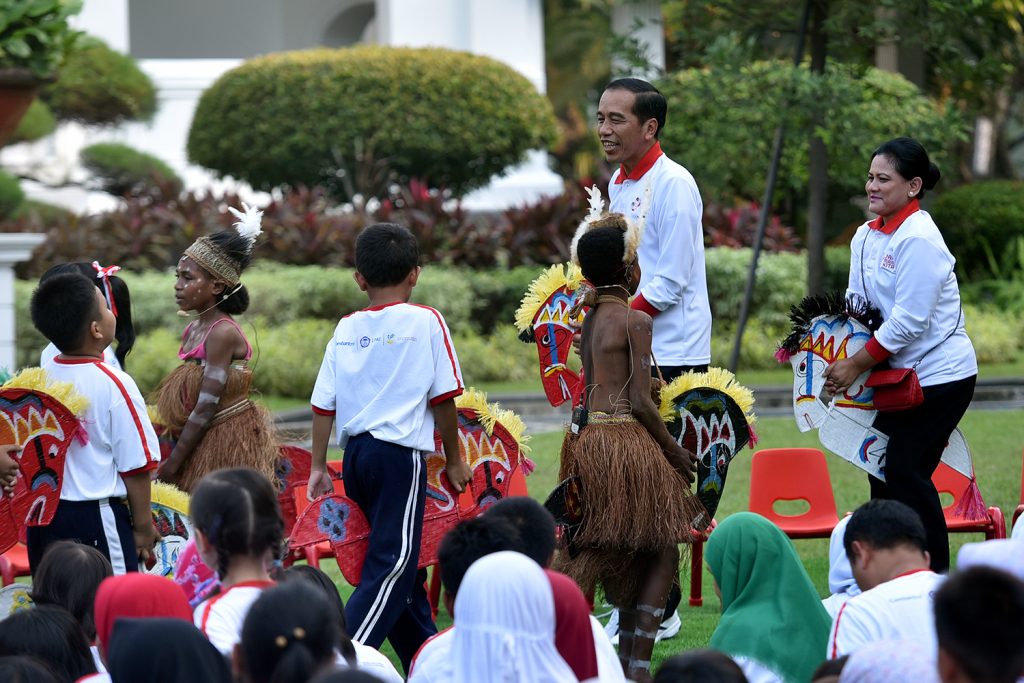 Acara diawali dengan pertunjukan tarian yang dibawakan oleh anak-anak SD Inpres Sulu Distrik Agats, Asmat. Kemudian Presiden Jokowi dan Ibu Negara bersama anak-anak menyanyikan lagu anak-anak secara medley sambil memainkan kuda lumping.